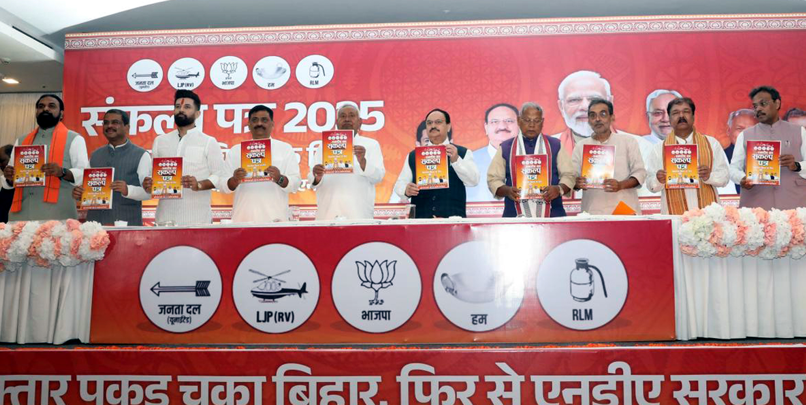 ஒரு கோடி இளைஞர்களுக்கு வேலைவாய்ப்பு, பள்ளிகளில் காலை உணவு திட்டம் உள்ளிட்டவற்றை வழங்கும் என பீஹாரில் தேசிய ஜனநாயக கூட்டணி சார்பில் தேர்தல்…..