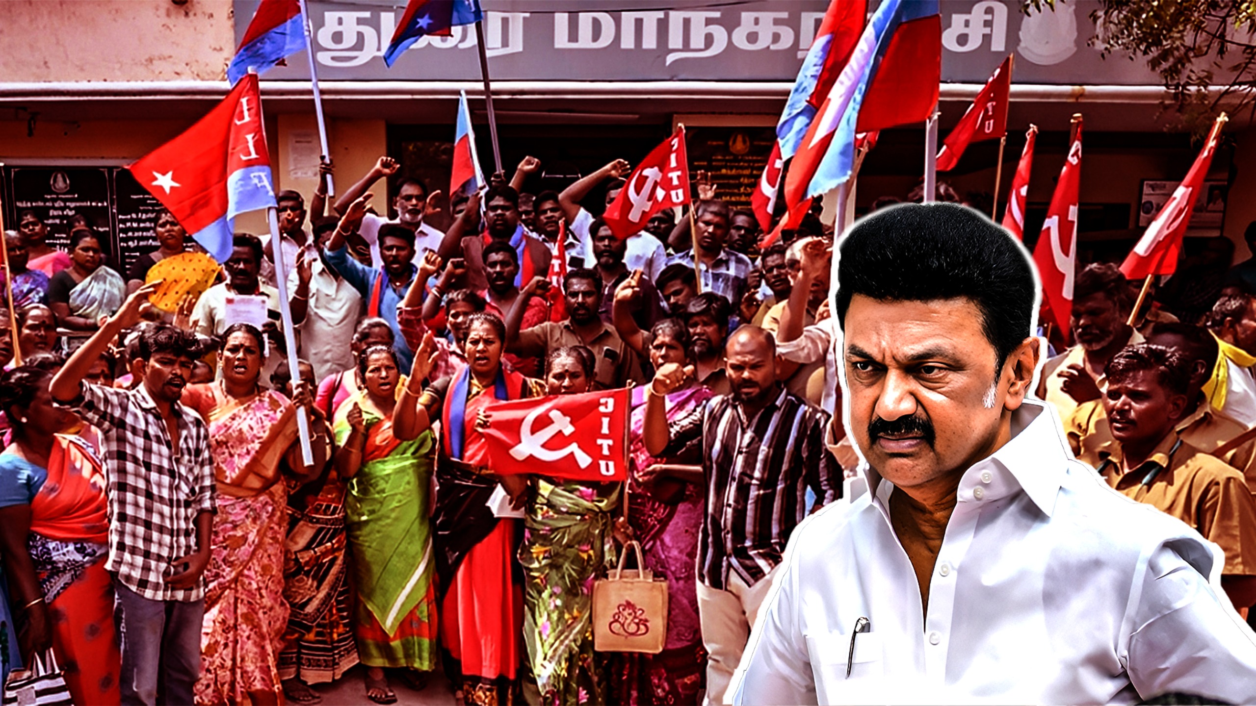 கடந்த நான்கரை ஆண்டுகளாக அளித்த வாக்குறுதியை துளியும் நிறைவேற்றாமல் மக்களை ஏமாற்றிய திமுக அரசு, இப்போது தூய்மை பணியாளர்களையும் அதேபோல் தான் நடத்துகிறது. இதனை எதிர்த்து திமுக கூட்டணிக் கட்சியான கம்யூனிஸ்டின் தொழிளாலர்கள் சங்கம் நிர்வாகிகள், மற்றும் விசிக கட்சியினரே போர்க்கொடி தூக்கியுள்ளனர். மதுரை மாநகரில் பணிபுரியும் தூய்மை பணியாளர்கள், நேற்று மாநகராட்சி மண்டலம்-3 அலுவலகம் முன் போராட்டம் நடத்தினர்.