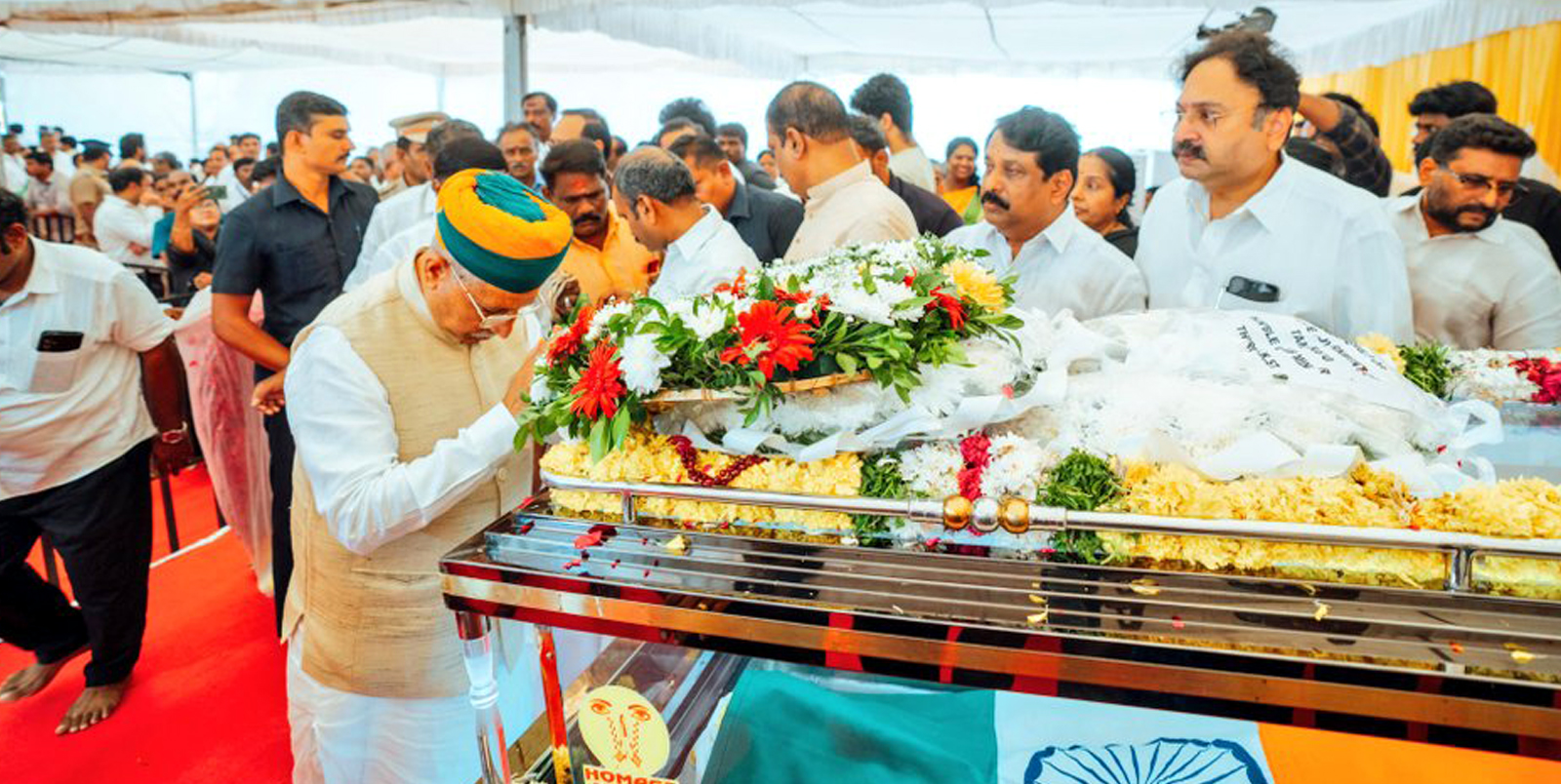 நாகாலாந்து மாநில ஆளுநர் இல.கணேசன் உடலுக்கு மத்திய சட்டத்துறை அமைச்சர் அர்ஜுன் ராம் மேக்வால் மற்றும் மத்திய இணை அமைச்சர் எல்.முருகன் ஆகியோர் இன்று (ஆகஸ்ட் 16)