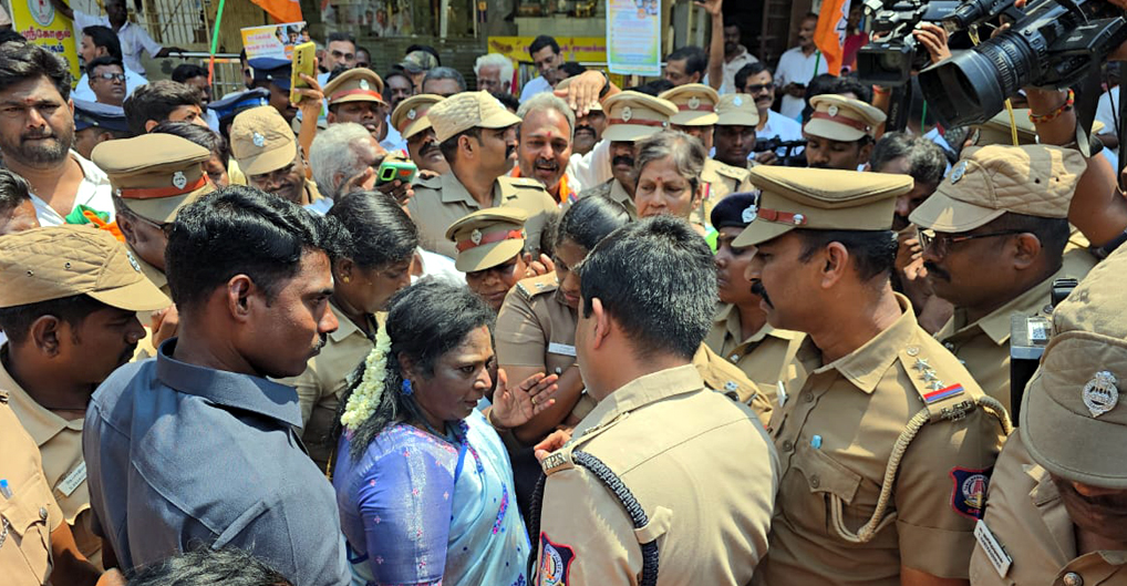 மும்மொழி கொள்கைக்கு ஆதரவாக கையெழுத்து பெற சென்ற தமிழிசையை 3 மணி நேரம் வெயிலில் காக்க வைத்த போலீஸ்
