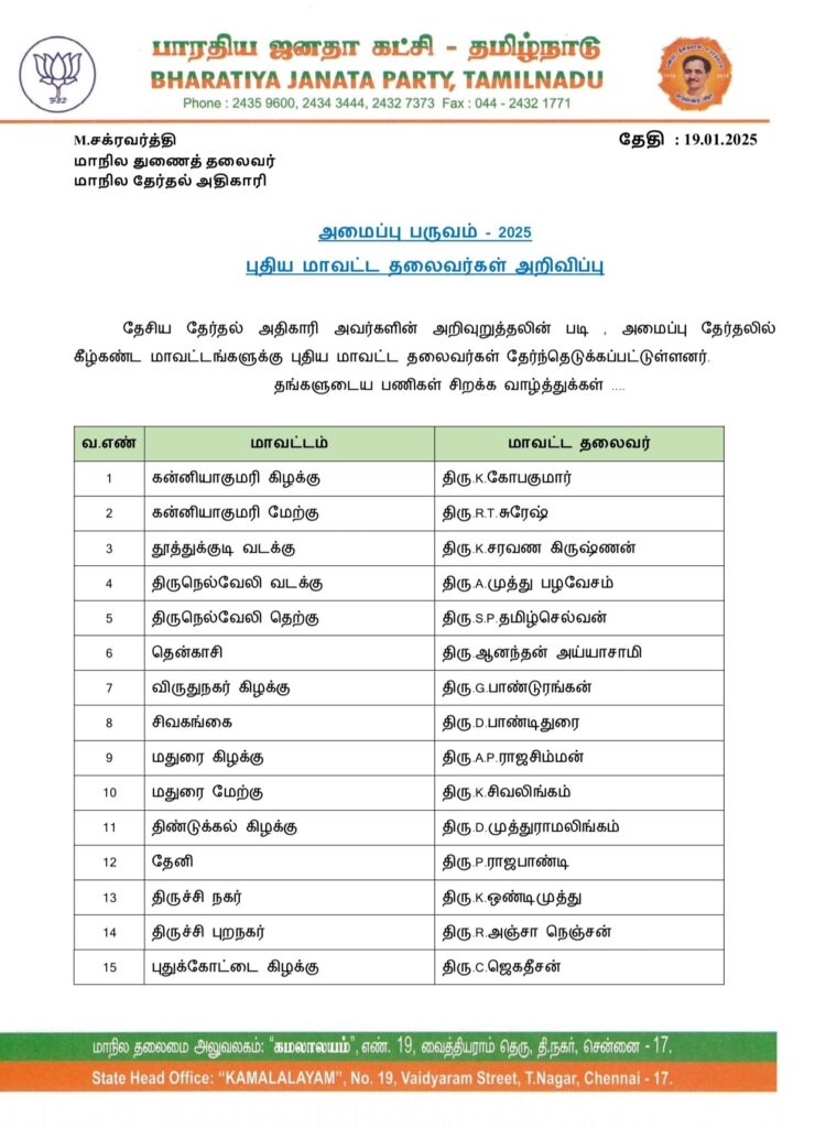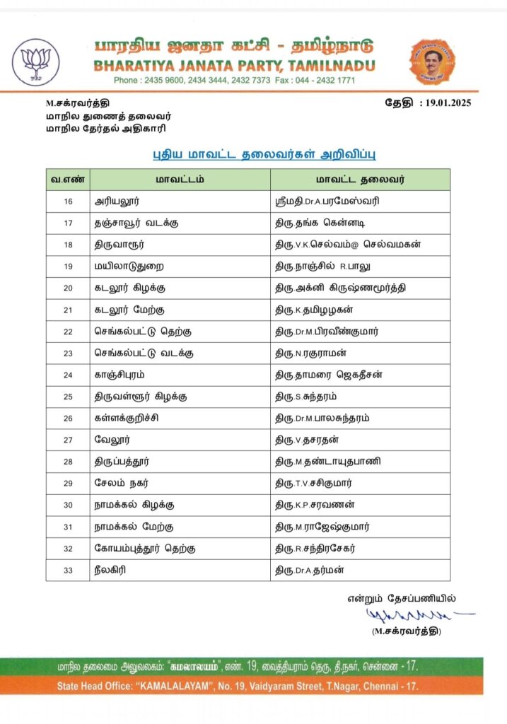 தமிழக பாரதிய ஜனதா கட்சியின் முதற்கட்டமாக 33 மாவட்டங்களுக்கான மாவட்ட தலைவர்கள் பட்டியல் வெளியாகியுள்ளது.