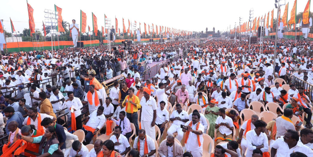 பிரதமர் மோடி தலைமையின் கீழ் அணிவகுத்து, பாரதத்தின் வளர்ச்சிப் பயணத்தில், இந்த நிறைவு பயணம் வாயிலாக நாம் பங்கு பெறுவோம் என இந்த மாபெரும் அவையின் வாயிலாக தமிழக மக்களுக்கு அறைகூவல் விடுக்கிறேன். தமிழகத்தில் 2026 ஏப்ரலில் தேசிய ஜனநாயகக் கூட்டணி ஆட்சி மலரும். பாஜக, அதிமுக மற்றும் கூட்டணிக் கட்சிகள் சேர்ந்து வலுவான கூட்டணி அமைத்து ஆட்சி அமைக்கப் போகிறோம்.
